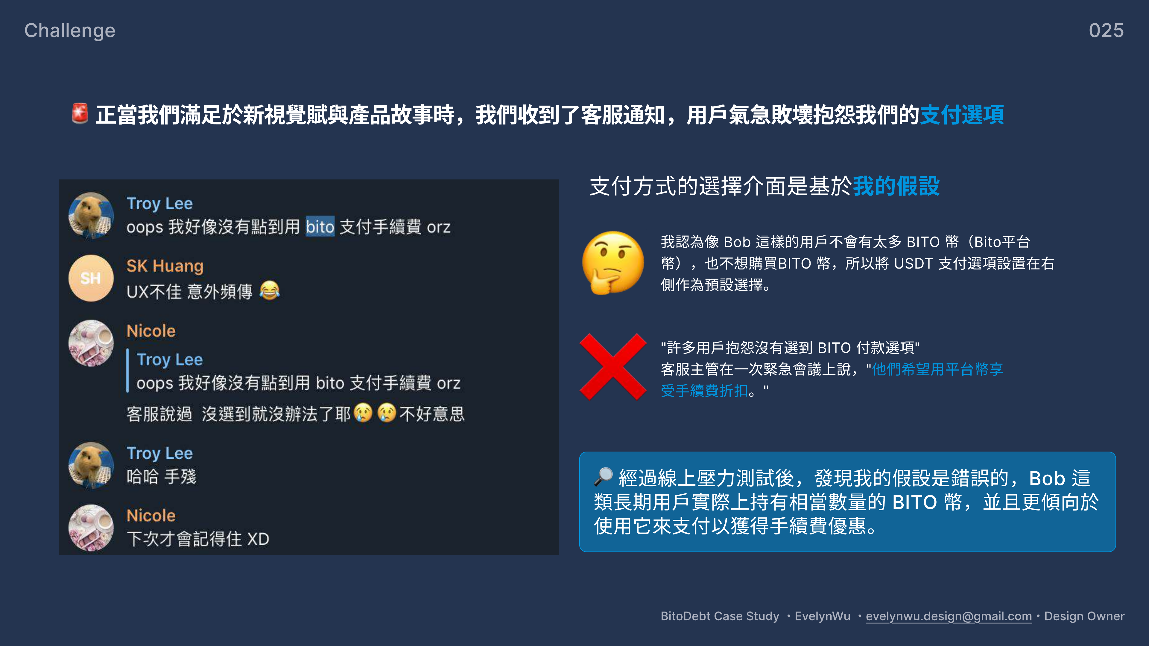 After the BITO payment incident, I joined user Telegram groups, attended weekly CS meetings, recruited interview participants through CS. The most critical design fix came from a forwarded complaint β not from data analysis.